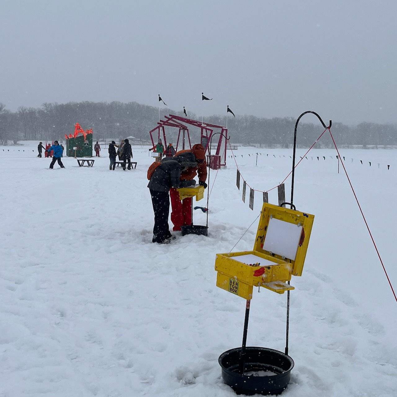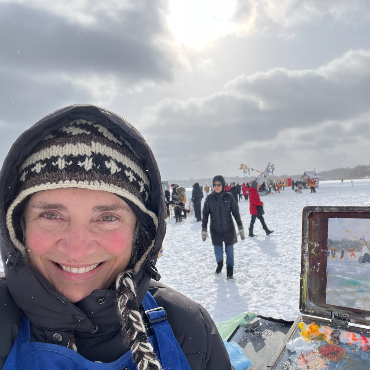 Outdoor Painters of Minnesota deploys hardy winter plein air artists to paint in the Art Shanty village again in 2026. Undaunted by cold, wind, snow, and ice, winter plein air painters paint in all weather. OPM’s Berton Boxes—public painting pochades—will be invitingly placed for visitors to try winter-proof art materials like oil crayons and non-toxic solvents that can move the paint around on a canvas in exciting ways to create their own paintings on 8×10 canvases to display or take home.